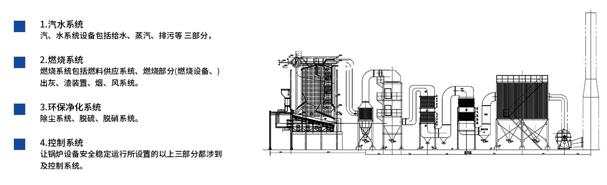 ● 一二次风合理配比。在锅炉前后墙适当高度设计有多个二次风喷口,对燃烧的挥发份高速扰动并形成切向圆运动,延长烟气流程,确保充分燃烧;炉排下的风室多仓布置,根据燃烧需要合理配备一次风,即保证了充分燃烧,又避免了较大的空气过剩系数。