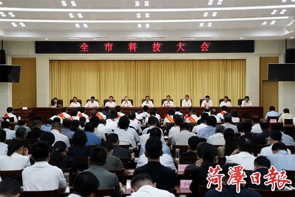 会议宣读奖励决定和奖励通报。市委书记张伦为“菏泽市重大科技贡献奖”获奖者张春雨颁奖。市重大科技贡献奖为我市科技领域最高荣誉,该奖项的设立,旨在褒奖在科学技术创新、科技成果转化和高新技术产业化中,取得重大技术发明、技术创新并创造了巨大的经济效益或者社会效益的先进科技工作者,是对科技工作者勇立科技潮头、矢志自主创新、掌握关键技术、推动行业进步的高度肯定,更是对其将科技成果转化现实生产力,以科技创新支撑引领经济社会高质量发展的高度认可。