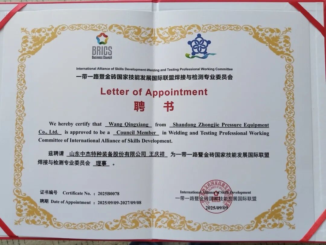 本次大赛组委会特聘我公司高级技师王庆祥担任大赛裁判。王庆祥拥有20多年焊接及培训经验,为国家级大赛裁判员、高级工程师、机械行业特级技师、中国机械工业人才评价中心专家,同时担任一带一路暨金砖国家技能发展国际联盟焊接与检测专业委员会委员。此次受邀执裁,不仅是对其个人专业能力的高度认可,也充分体现了中杰特装在焊接技术领域的深厚积淀与行业权威。赛事期间,我公司生产的LCO₂(液态二氧化碳)及LAr(液态氩气)深冷容器承担了大赛焊接气体的储存与保障任务,为大赛顺利推进提供了可靠支撑,赢得组委会与参赛各方的一致好评。